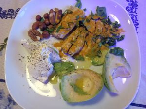 Pour Gilles, inspiré par Gregory : maquereaux avec du curcuma, basilic du jardin, ricotta, quelques noix diverses et 1/2 avocat. Et une grande tasse de café noir.