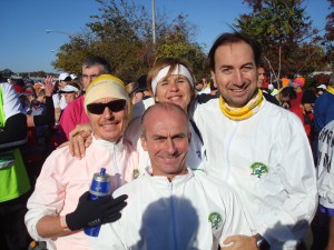 Nous nous retrouvons dans le corral de départ ; Franck et moi avons « triché » pour être tous ensemble, normalement nos dossards ne nous le permettaient pas. Thierry n’a pas arrêté de me chambrer sur mon dossard « Elite » (1-135) et je ne sais vraiment pas pourquoi j’ai un tel numéro et ça me met la pression ! Il reste encore plus d’une heure à attendre… Autour de moi, une foule diverse et bigarrée de toutes nationalités et apparences physiques, un Indien d’Amérique du Sud avec un casque à plumes, un mexicain, des japonais, des italiennes qui font une expérience scientifique et qui courent avec des capteurs, dont une fait un marathon par mois … Nous portons tous de vêtements d’attente : vieux sweat, pyjama en rayonne dorée (!!!), sac poubelle customisé, tout y passe, un vrai défilé de mode recyclable. C’est beaucoup moins oppressant que Paris, où on à l’impression d’être dans la fosse à un concert d’AC/DC et où on patauge dans la pisse. Tout le monde s’étire dans tous les sens, je repense à l’article de Blaise Dubois qui explique que ça ne sert absolument à rien, au contraire. Encore une fois je médite sur le caractère toujours changeant des vérités absolues…