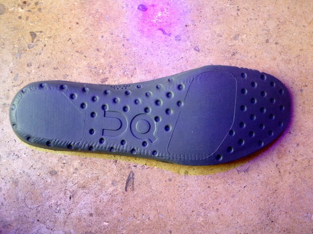 On remarque aussi les dents sur les plots, qui vont rigidifier la semelle au moment de l’impact de la chaussure sur le sol, pour permettre la stabilité et le rendement énergétique.