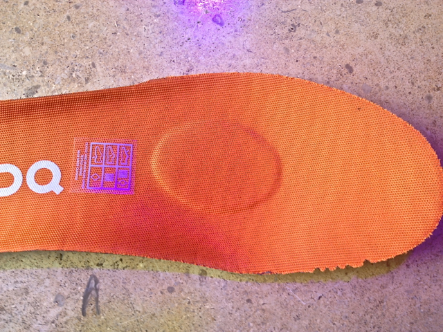 De l’autre côté, à part le message « I fly you to the finish line » on remarque un renfort sous les métatarsiens qui doit lui aussi contribuer à l’amorti. C’est une zone du pied qui est particulièrement sollicitée lors de la phase de propulsion.
