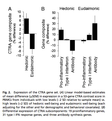 L’étude que j’ai lue indique que les personnes qui ont un haut niveau de bonheur «eudémonique » ont des niveaux de marqueurs d’inflammation très bas et une expression élevée des gènes améliorant la résistance immunitaire, et en tous cas à l’opposé de ceux qui ont un bonheur « hédoniste ».