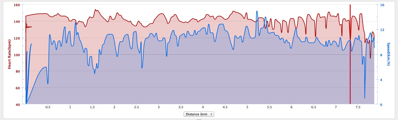 Par contre il y a peut-être un impact sur mon efficacité énergétique, parce que je vais courir à 9,3 avec une FC de 140, soit 8% de moins que ma performance moyenne sur ce type de course. On dira que c’est à cause des poids, mais j’y crois moyen vu que mon poids à moi fluctue facilement de 2 kilos. Ceci je n’ai jamais mesuré la corrélation entre les deux, il faudrait que j’essaye.