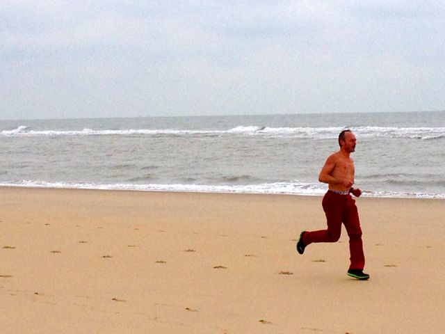 Et suite à une ballade sur la côté sauvage près de Royan, je n’ai pas résisté à quelques foulées sur le sable. Torse nu évidemment (7 degrés, vent de 20 km/heure). Mais au moins ma femme a pu faire quelques photos avec la foulée la plus aérienne que me connaisse. OK, c’est pas une référence, mais si ça me rassure, moi, hein ?