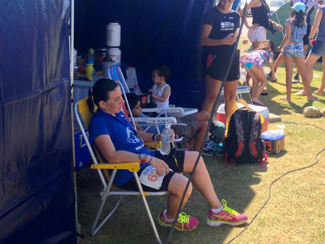 Hé bien, en les regardant, pas mal de monde. Enfin, tout est relatif, il doit y avoir une bonne centaine de compétiteurs. Mais de tous types. Un gang de végétariens et fiers de l’être, quelques triathlètes baraqués, des jeunes, des vieux, des hommes, des femmes … Bien sur pour se lancer dans un truc pareil, il faut savoir un peu ce qu’on fait : c’est pas exactement comme une corrida de 10 kilomètres où on peut finir même sans aucun entrainement (faire un temps est une autre histoire, je vous l’accorde).  Ils ont des tentes, des suiveurs (qui n’ont pas beaucoup besoin de bouger vu que ça fait 400 mètres aller retour) mais c’est du sérieux. On verra des chaussures découpées pour ne pas avoir d’ampoules, du taping en veux tu en voilà (Arnaud se serait régalé à voir tout ça), des ravitos avec des glucides à gogo, et de la crème solaire qui dégouline de partout …