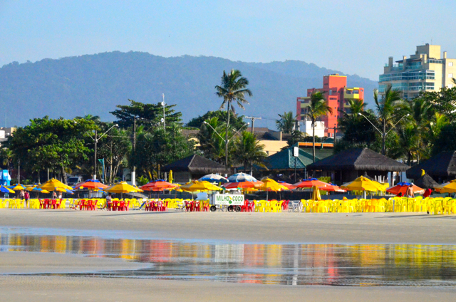 Nous partons à la plage. Au Brésil, en plus du marchant de glaces occidental, on trouve une variété infinie d’offres alimentaires. Déjà, on ne met pas sa serviette n’importe où : sous un parasol de « Kioske » qui offre boissons, frites, et divers plats.