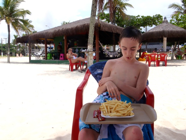 Il fait chaud, juste avant ou juste après avoir été dans l’eau, on boit : un soda pour les enfants (le produit local s’appelle du Guarana, c’est aussi sucré que du Coca, et il y a des versions light, aussi dégueulasses au goût que le Coca Zero) ou une bière pour les grands, voire une caipirinha. Si on veut se faire croire qu’on boit sain, un jus de fruits pressé : orange, kiwi, fruit de la passion, et tous les autres dont le nom est imprononçable pour un gringo comme moi.