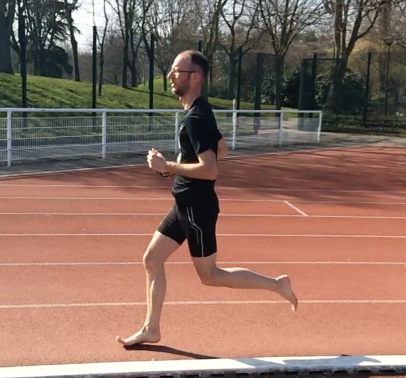 Les orteils sont relativement relâchés. Il est peut être un peu en extension au moment de l’impact ? (la foulée idéale est quand le pied touche le sol à l’aplomb du bassin) … et un peu « droit » – on est censé mieux courir quand on est en déséquilibre léger sur l’avant.