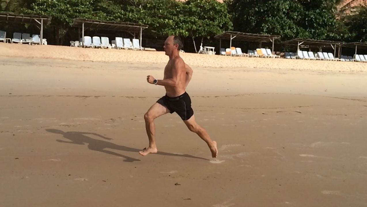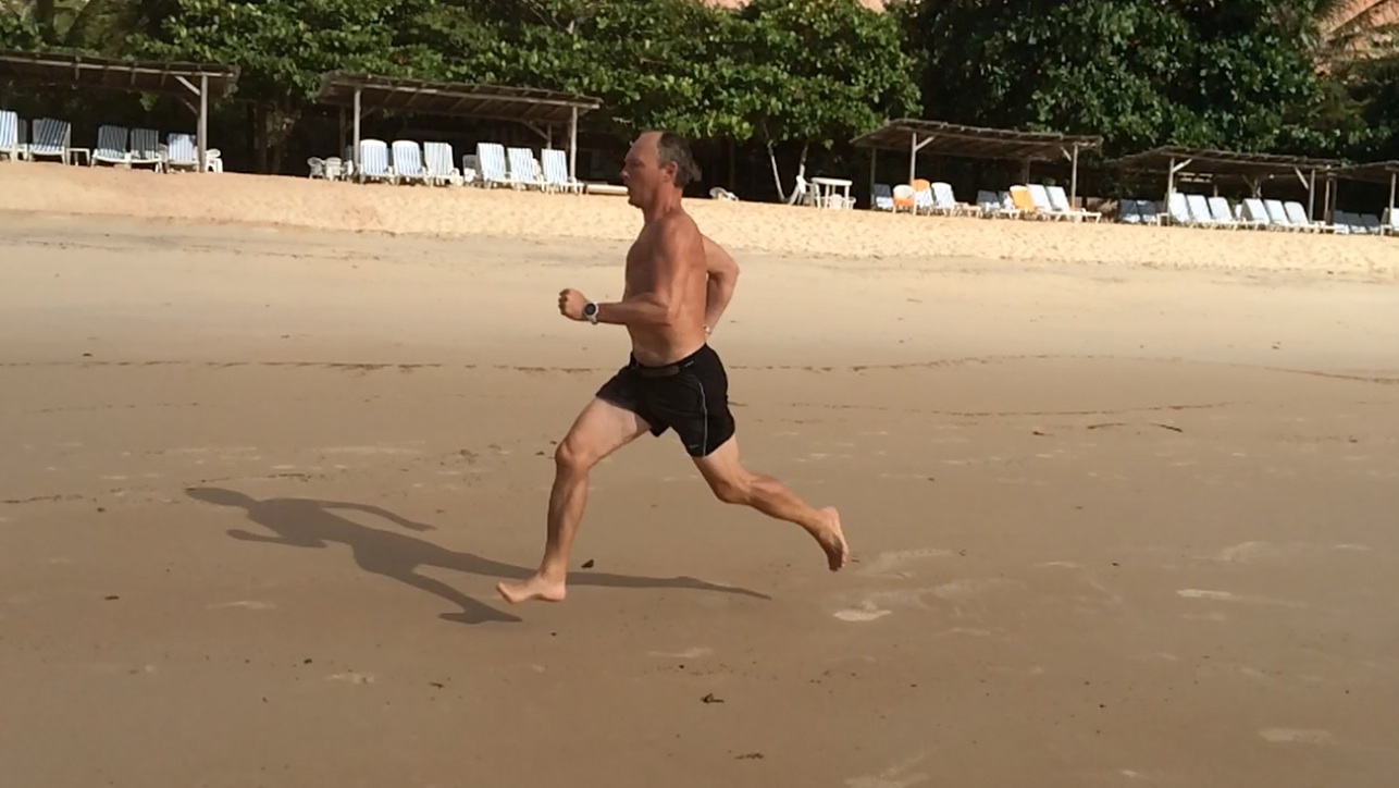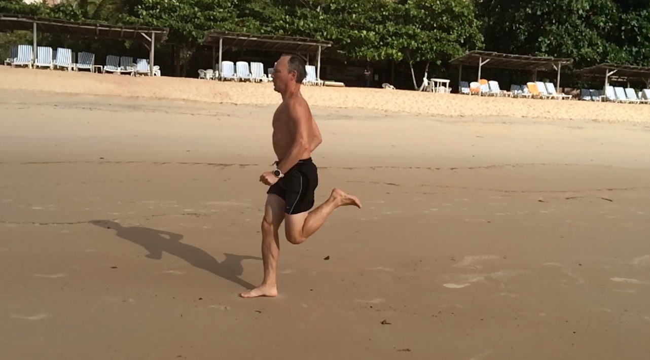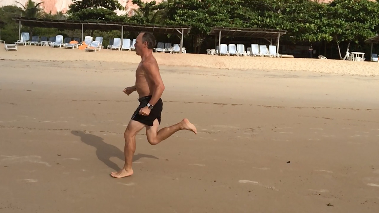 Trop droit, un peu arqué en arrière, comme beaucoup de coureurs Les épaules bougent beaucoup, et de haut en bas et la colonne vertébrale n’est pas suffisamment rigide, la faute aux dorsaux et aux abdominaux profonds, je suppose. Et évidemment, pas mal de gras en trop, uniformément réparti sur le torse. Comme dirait ma belle-mère, la Caipirinha est une invention du diable, c’est pour ça qu’on n’en met pas dans les bénitiers. Bon tout n’est pas à jeter : on voit bien la poussée sur le décollage (avec un petit nuage de sable), et l’impact au sol est bien juste sous la bassin, pas en avant ou en arrière. Le pied touche pratiquement les fesses en course rapide.