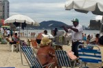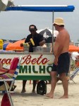 Je reste toujours sidéré par l’importance de la nourriture au Brésil … Ici sur la plage, à Guaruja, je me suis amusé à faire des photos sans quitter mon parasol, pendant 5 minutes, pour voir ce qui passait à portée. Manque le marchand de gambas, et le serveur de caipirinhas et autres cocktails.