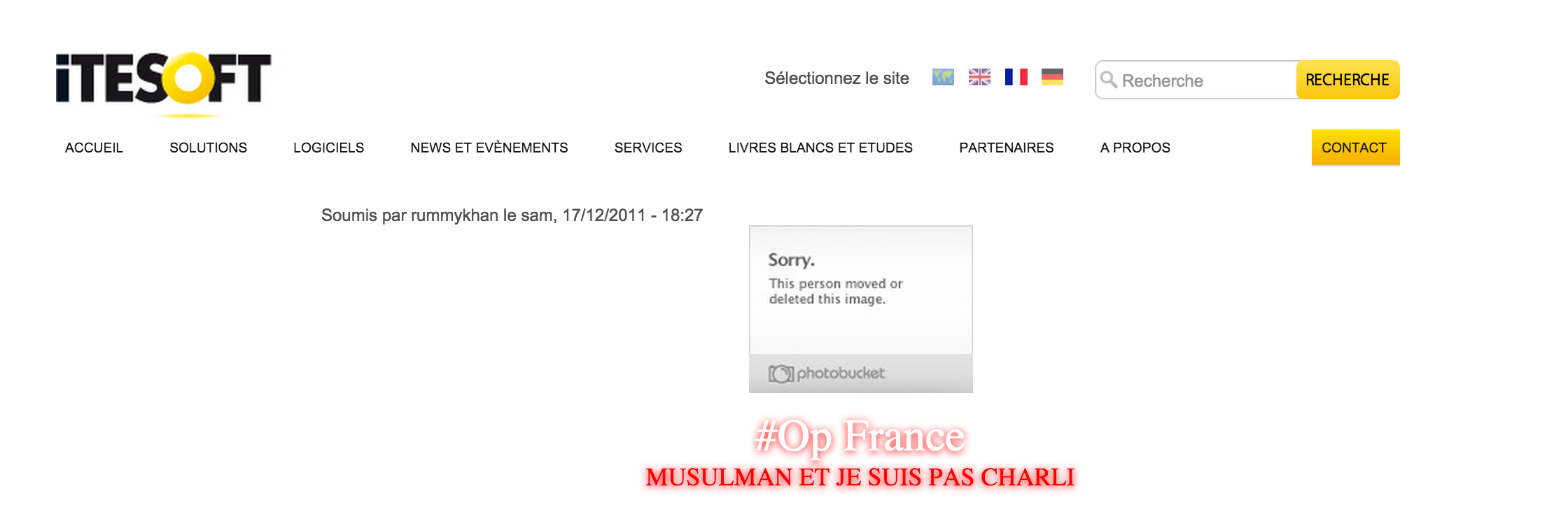 On ne parle que de terrorisme, de nouvelles lois, d’hommages aux victimes, policiers, journalistes, juifs, mulsulmans … Les musulmans ont peur de l’amalgame. On les comprend. Notre site web s’est fait hacker, comme 19.000 autres cette nuit. Ce qui est écrit est clair : HackSiteItesoft
