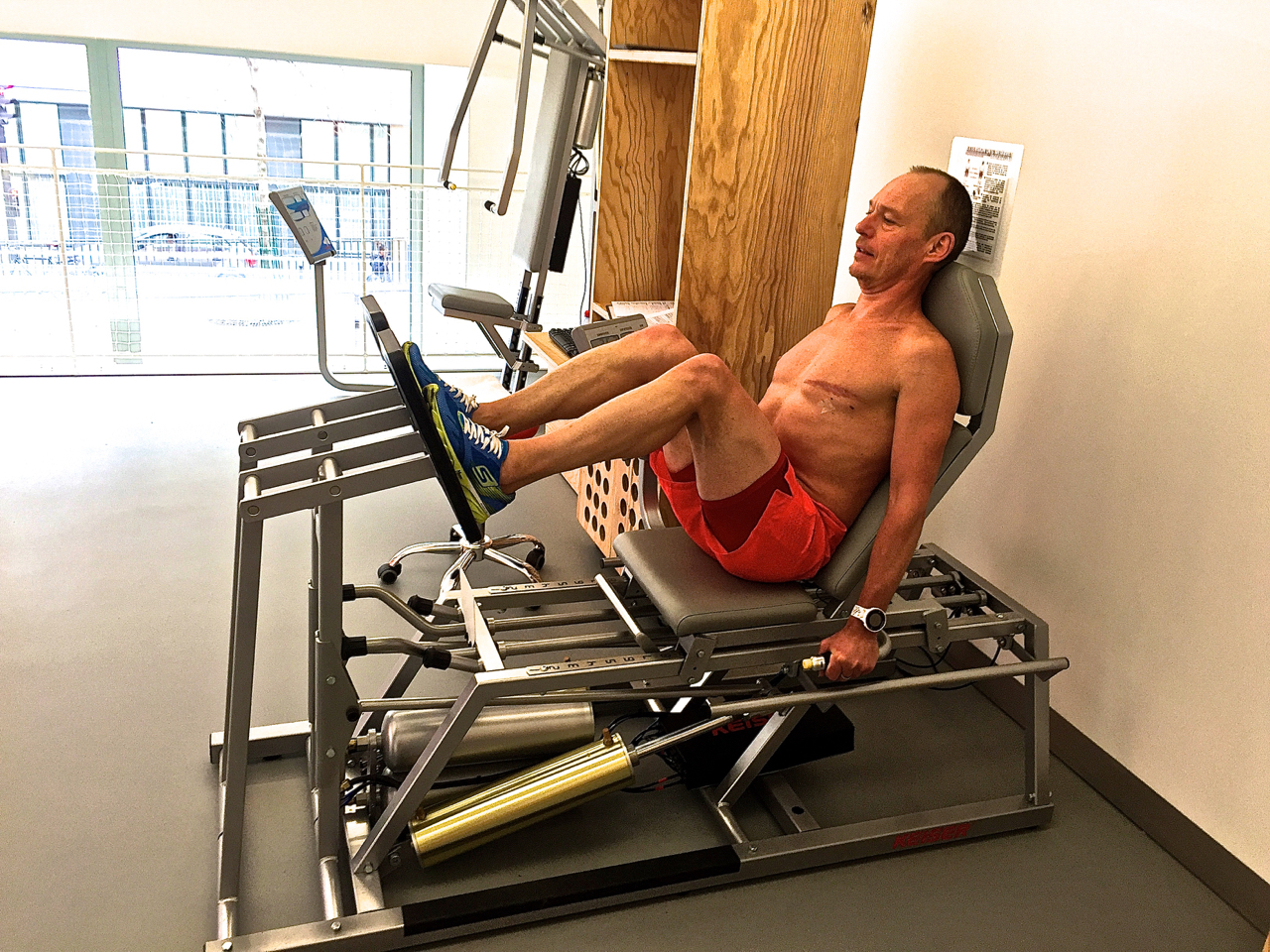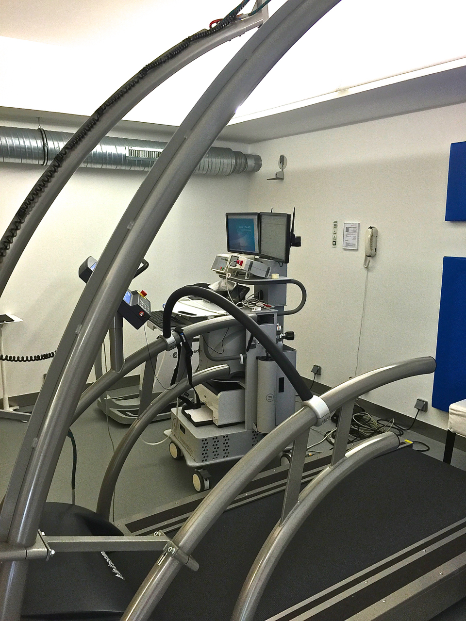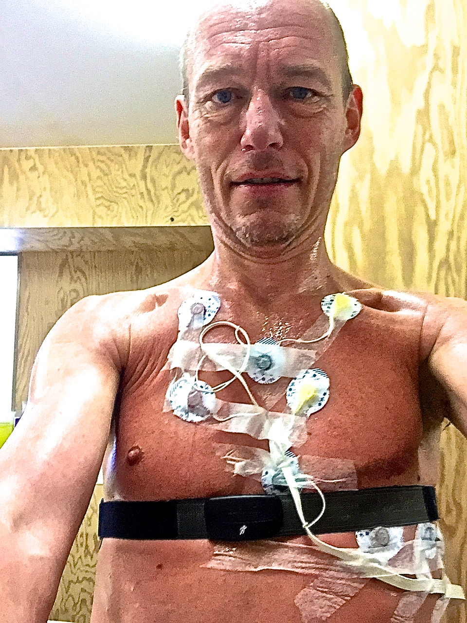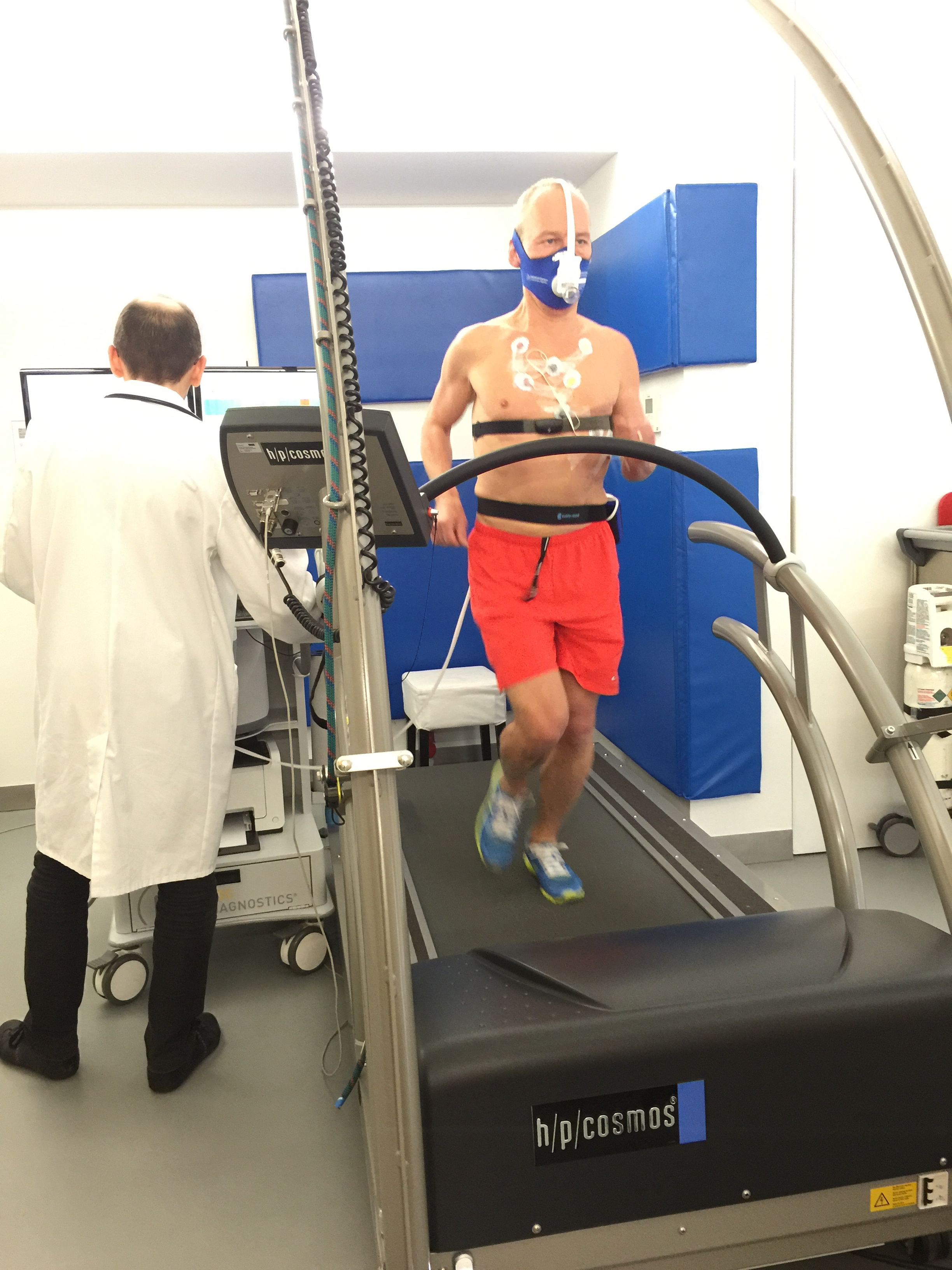 C’est bien beau de papoter en regardant son gras à l’écran mais je ne suis pas venu que pour ça et l’épreuve que je redoute arrive. J’ai déjà vécu le masque, les électrodes et tout le bordel plusieurs fois, donc je leur raconte mes aventures avec Véronique Billat. Le cardiologue me trouve une tension élevée au repos (49 pulsations), comme souvent (149/95).